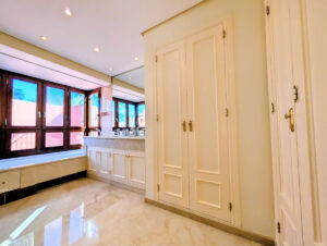 Una elegante escalera conduce a la planta superior, donde se encuentra la suite principal, que incluye el dormitorio, el baño con vestidor y dos amplias terrazas. Una de ellas es privada para la suite y la otra tiene acceso independiente desde el vestíbulo. Esta magnífica terraza soleada cuenta con zonas para tomar el sol y sentarse, desde ella se pueden disfrutar de impresionantes vistas panorámicas e increíbles puestas de sol.