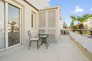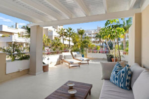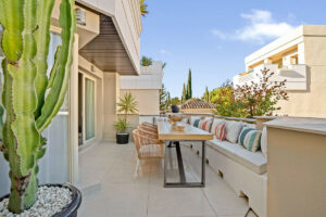 Una de las características más destacadas es la amplia terraza envolvente de casi 100 metros cuadrados, con múltiples zonas de relax y comedor. Perfectamente adaptado al estilo de vida al aire libre de Marbella, incluye ducha exterior y preinstalación para jacuzzi, creando un entorno idílico para la relajación y el entretenimiento.