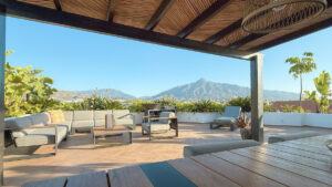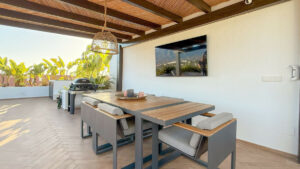 Salga a la amplia terraza y disfrute de vistas panorámicas a la montaña La Concha. Perfecta para relajarse o recibir invitados, incluye una zona lounge y comedor, barbacoa, ducha exterior e incluso una pared de cine al aire libre, ideal para días soleados o noches acogedoras bajo las estrellas.