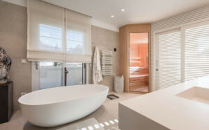 La propiedad cuenta con una suite principal completa con vestidor, baño privado y sauna, además de dos dormitorios adicionales, uno de ellos con baño privado. Entre las comodidades adicionales se incluyen un amplio salón-comedor, un aseo de cortesía, varias terrazas grandes, una cocina moderna totalmente equipada, acceso directo por ascensor privado, calefacción por suelo radiante en toda la vivienda, mosquiteras en todas las puertas, sistema domótico Gira, persianas eléctricas y aparcamiento subterráneo para dos vehículos, todo integrado con sistemas domóticos avanzados. El complejo dispone de piscina climatizada y vigilancia las 24 horas.
