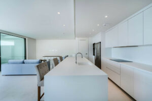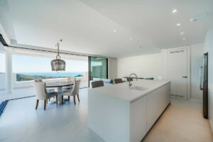 Diseñado para quienes buscan una conexión perfecta entre los espacios interiores y exteriores, la cocina de concepto abierto fluye armoniosamente hacia la amplia sala de estar, que se extiende a una terraza expansiva donde podrá deleitarse con vistas al mar sin interrupciones. La luz natural inunda cada rincón del hogar, creando una atmósfera luminosa y aireada, mientras garantiza una total privacidad.