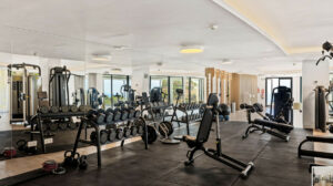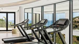 Gimnasio completamente equipado con vistas panorámicas, ideal tanto para entrenamientos intensos como para sesiones de yoga en un ambiente sereno.