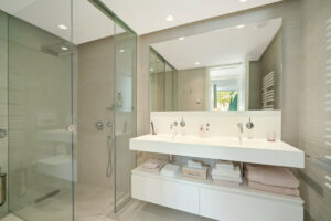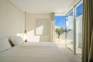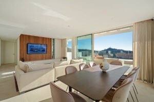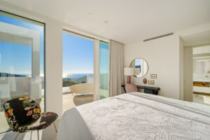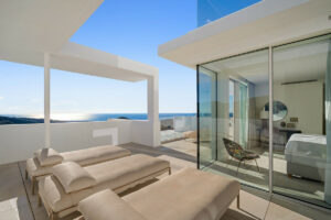 La propiedad cuenta con un amplio espacio de salón y comedor de planta abierta, con una cocina de diseño equipada con electrodomésticos Gaggenau, que se conecta de forma fluida con las amplias terrazas a través de puertas correderas de suelo a techo. Las múltiples terrazas distribuidas por toda la vivienda crean una excelente conexión interior–exterior y garantizan privacidad con vistas abiertas al mar y la montaña.