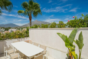 En la planta superior, un espectacular solárium con piscina privada, zona de almuerzo y descanso con preciosas vistas a la montaña más emblemática de La Costa del Sol.