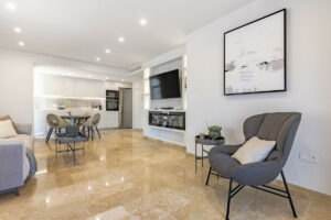 La propiedad consta de un amplio salón comedor con acceso a una terraza de 30 m2 orientada al oeste, 3 dormitorios y 2,5 baños, 1 de los cuales es en suite, cocina nueva (electrodomésticos nuevos – BOSH y SIEMENS). tiene suelos de mármol beige en toda la casa y cómodos armarios empotrados con lavadero contiguo. El apartamento después de la renovación completa. Materiales de alta calidad. Nuevo control de aire acondicionado en cada zona de la habitación. Chimenea (eléctrica). ventanas nuevas Todos los muebles de los apartamentos son marcas italianas nuevas y de alta gama (Armani Casa, Rubelli, DiTre, Potocco, Misuraemme, Tonon, Orizzonti).