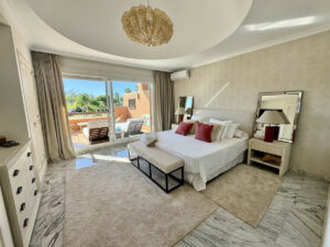 EXCLUSIVA -UNICO. PRECIOSO. REFORMADO E IMPECABLE. Amplio ático dúplex de 4 dormitorios, ubicado en Alhambra del Golf, una de las urbanizaciones más emblemáticas de Guadalmina Baja. Posee amplias estancias y dos terrazas en ambas plantas, que suman 70 metros. En la planta inferior se encuentra un gran salón comedor con acceso a la terraza semicubierta, con orientación sur y vistas a las zonas comunes de jardines, beach, piscinas y zona niños, de la urbanización. También dispone de cocina totalmente equipada, con zona de lavadero y dos dormitorios con ambos baños en suite, además de un aseo de invitados. En la planta superior se encuentra el dormitorio principal, con amplios techos abovedados y numerosos armarios, con su baño en suite y acceso a una gran terraza cubierta. En esta misma planta hay otro dormitorios con baño completo.