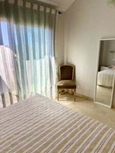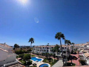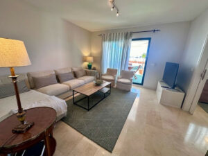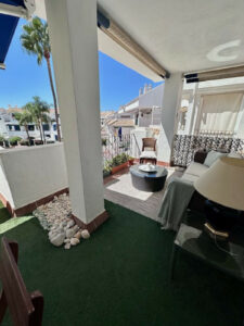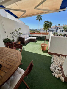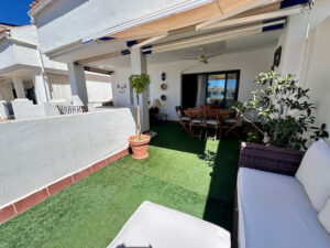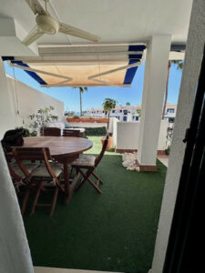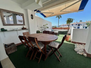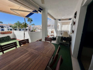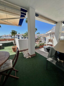 El salon, da salida a una magnífica terraza, la cual se cubre totalmente con toldos para aprovechamiento en el invierno de ella, y con unas vistas a la piscina de la urbanización y al mar estupendas. Ya que este complejo urbanístico se encuentra en primera linea de playa.