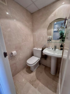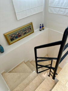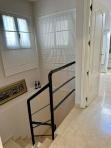 Salon, con baño para invitados, y gran capacidad de almacenaje, pues se han cerrado con armarios, todos los huecos de las escaleras, aprovechando al máximo el espacio.