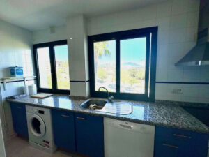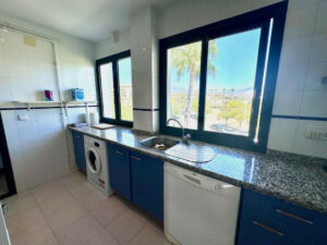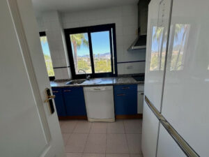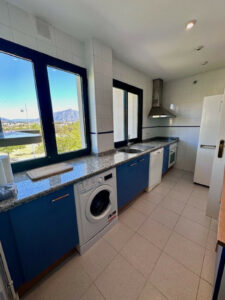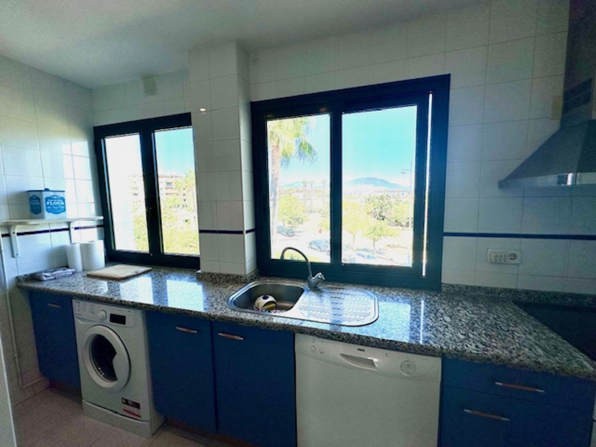 Hall de entrada amplio, con cocina a la derecha con vistas a la urbanización y una luminosidad extraordinaria, ventanas y luz natural. La zona de lavandería de la cocina ha sido acondicionada para un dormitorio con una cama de 90. Con lo cual, es una opción para un huésped más! .