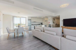 Ático recién terminado, completamente amueblado y equipado, con cuatro dormitorios y amplias terrazas, ideal para clientes exigentes que buscan confort en una nueva urbanización cerrada. El ático dispone de unos 119 m² de superficie interior y de más de 120 m² de terrazas, lo que suma aproximadamente 240 m² de espacio privado. El amplio salón con cocina americana da directamente a la terraza principal, mientras que los cuatro dormitorios y tres baños ofrecen comodidad tanto para la familia como para los invitados.