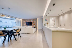 La vivienda se distribuye en un luminoso salón de planta abierta con cocina integrada totalmente equipada con electrodomésticos Whirlpool, que conecta directamente con una terraza cubierta ideal para desayunos o cenas al aire libre.