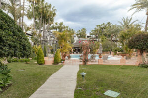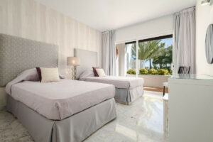 Uno de los elementos más distintivos de la propiedad es su espectacular terraza en la azotea, que supone más de 70 metros cuadrados de espacio privado al aire libre. Desde allí, se pueden disfrutar de vistas parciales al mar y de los exuberantes jardines con palmeras que rodean el complejo. Al caer la tarde, esta terraza se convierte en el escenario perfecto para contemplar las espectaculares puestas de sol de Marbella.
