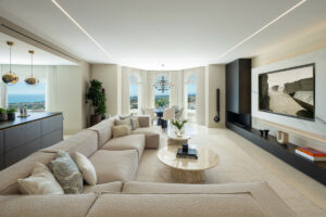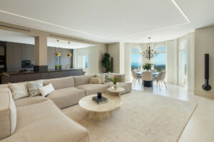 Recientemente renovado, el ático se distribuye en dos niveles y cuenta con un total de cuatro amplios dormitorios, cada uno con su propio baño en suite. Los interiores se definen por un concepto de diseño moderno que enfatiza las líneas limpias, acabados de primera calidad y una paleta de colores naturales. En el corazón de la vivienda, un salón abierto fluye hacia una elegante cocina Gaggenau, que presenta armarios de madera noble, encimeras de mármol pulido y detalles en microcemento que logran un equilibrio entre calidez y minimalismo. La distribución ha sido cuidadosamente planificada para maximizar tanto el confort como la funcionalidad, asegurando que cada estancia se sienta conectada, pero manteniendo la privacidad.