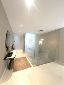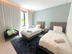 La propiedad se distribuye en dos plantas. En la planta principal, encontramos un amplio salón-comedor con chimenea y ventanales de suelo a techo que inundan el espacio de luz natural y ofrecen acceso directo a la terraza y a las zonas comunes. La cocina de diseño Fendi está integrada en el salón, creando un ambiente abierto y moderno. El dormitorio principal cuenta con un amplio baño en suite que incluye bañera y ducha, así como ventanales que aportan luminosidad y acceso a la terraza. Además, la planta dispone de un original baño de invitados y dos amplios dormitorios, ambos con baño en suite.