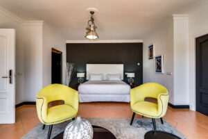 La distribución interior es abierta y acogedora, pensada para el confort y el estilo. A la izquierda de la entrada se encuentra un espacioso salón con una imponente chimenea, que aporta calidez y sofisticación. La cocina, completamente equipada, se complementa con una práctica zona de lavandería exterior. La propiedad cuenta con seis dormitorios, todos con baños en suite que garantizan privacidad y comodidad. Uno de ellos, ubicado junto al salón, resulta ideal para invitados o familiares. Los otros dormitorios, bien distribuidos, se sitúan al otro lado de la vivienda junto a un aseo de cortesía.