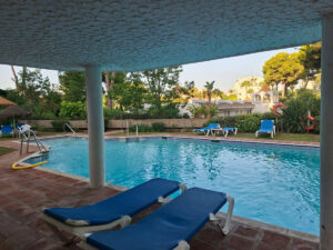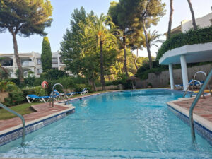 La residencia dispone de excelentes zonas comunes como **piscina comunitaria, pista de tenis, jardines cuidados y aparcamiento privado**.
