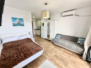 Un estudio amueblado con cocina equipada se encuentra en un edificio con piscina y jardin que esta en segunda linea de la playa rodeado de todo tipo de servicio y a 15 minutos andando del Puerto Marina Benalmadena.