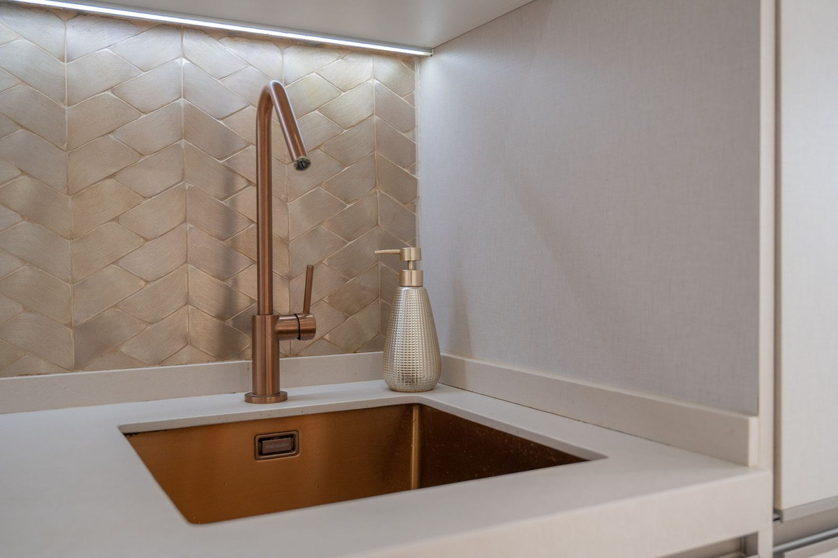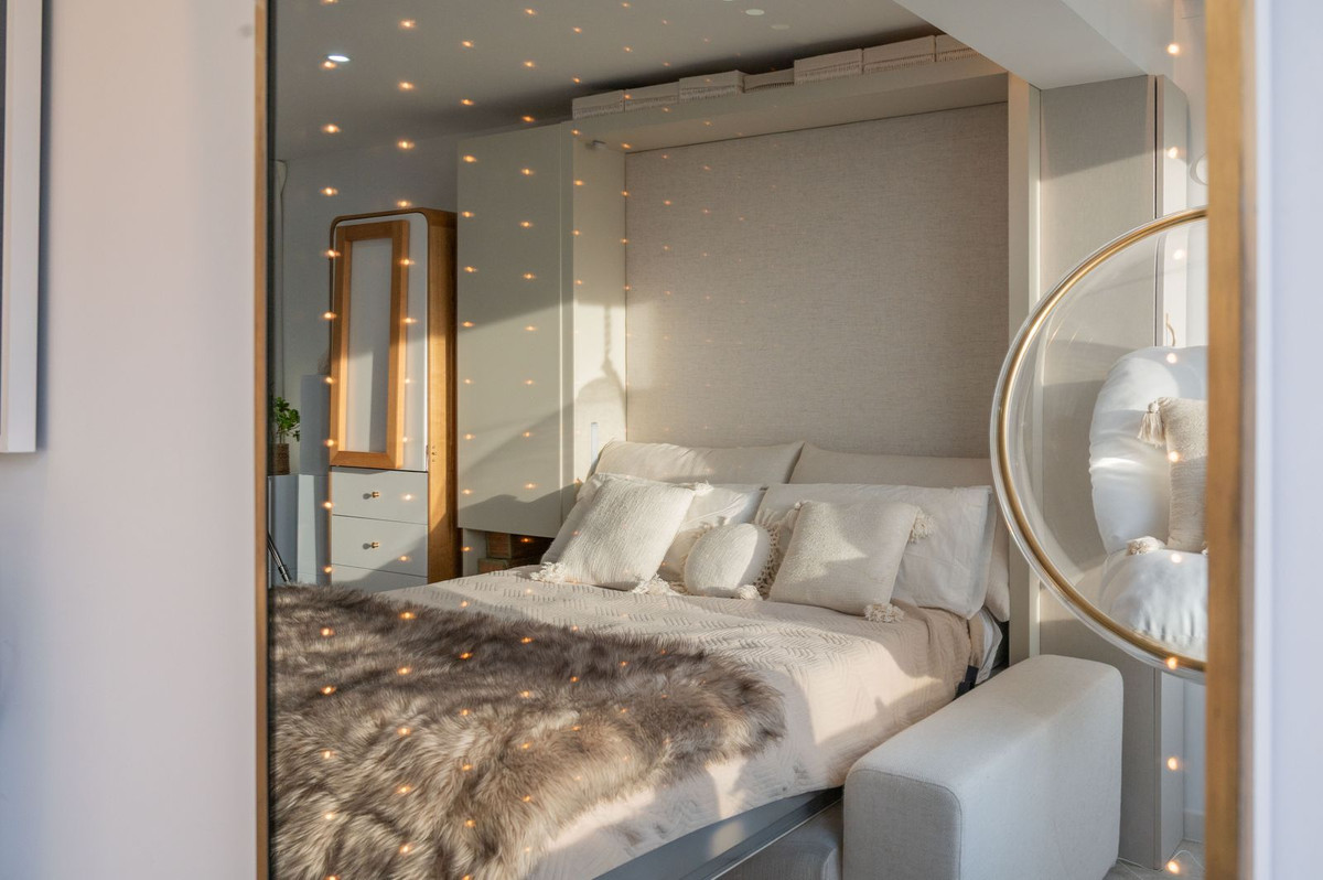 Cada centímetro del estudio se ha aprovechado al máximo, ofreciendo amplias soluciones de almacenamiento integradas que maximizan el espacio sin comprometer la estética. El interior combina funcionalidad con un diseño boutique, creando un ambiente refinado y muy habitable.