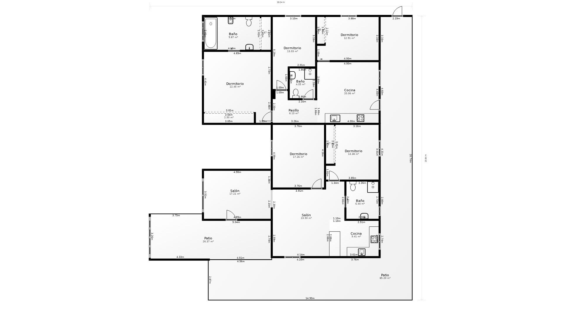 Esta espectacular finca alberga una casa de 1 sola planta que actualmente está dividida en 3 viviendas que hacen un total de 7 dormitorios y 4 baños, 3 cocinas, y 3 salones.
