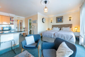 El establecimiento cuenta con 8 amplios apartamentos totalmente equipados, todos con terraza privada y vistas al mar, distribuidos en un edificio moderno y luminoso. Cada unidad dispone de cocina completa, salón, dormitorio independiente, baño y aire acondicionado.