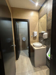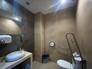 En la cafetería hay aseos para minusválidos, señoras y caballeros