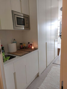 El interior es luminoso, moderno y soleado, y cuenta con dos amplias habitaciones, un baño y una cocina integrada, que ofrecen comodidad y funcionalidad. Grandes ventanales inundan el espacio de luz natural, creando un ambiente acogedor e inspirador.