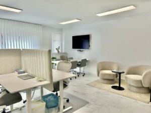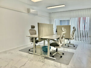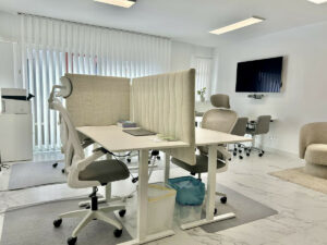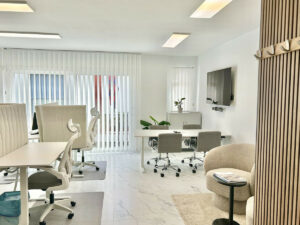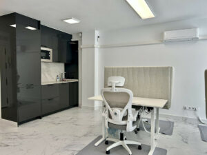 El interior es luminoso y espacioso, con grandes ventanales, excelente luz natural y un diseño moderno y limpio. La oficina se entrega completamente amueblada con mobiliario escandinavo de alta calidad, creando un ambiente profesional y tranquilo con sillas ergonómicas, escritorios modernos y una acogedora zona de descanso. Una pequeña terraza privada aporta un toque extra de ambiente y encanto.