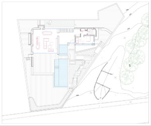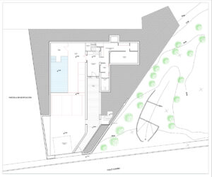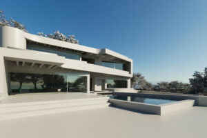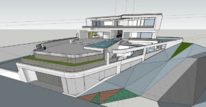 El diseño propuesto contempla una villa contemporánea de tres niveles con ventanales de suelo a techo que se abren a vistas panorámicas. El plano incluye una amplia zona de estar de concepto abierto, cuatro dormitorios, una cocina moderna, un gimnasio privado, una piscina interior y varias terrazas. Cada espacio está pensado para aprovechar al máximo la luz natural y conectar de forma fluida con el exterior.