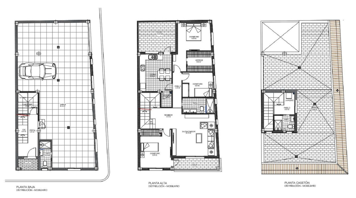 El proyecto actual contempla un garaje de 100 m² en la planta baja, 120 m² de espacio habitable en la primera planta y un solárium de 76 m² con baño y trastero en la planta superior.