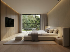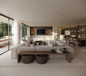 El acceso a la villa según proyecto se realiza tanto peatonalmente como en vehículo desde la calle, conduciendo a dos zonas de aparcamiento: un espacio abierto bajo pérgola y un garaje cerrado con trastero anexo. Este nivel de entrada también cuenta con un elegante vestíbulo y el núcleo de circulación vertical, compuesto por escaleras y ascensor que conectan las tres plantas.
