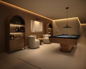La planta sótano, accesible por escaleras y ascensor, ofrece una amplia sala, además de una sala eléctrica y una sala técnica. Una sala técnica adicional, situada bajo la zona de tumbonas, alberga las instalaciones de la piscina.