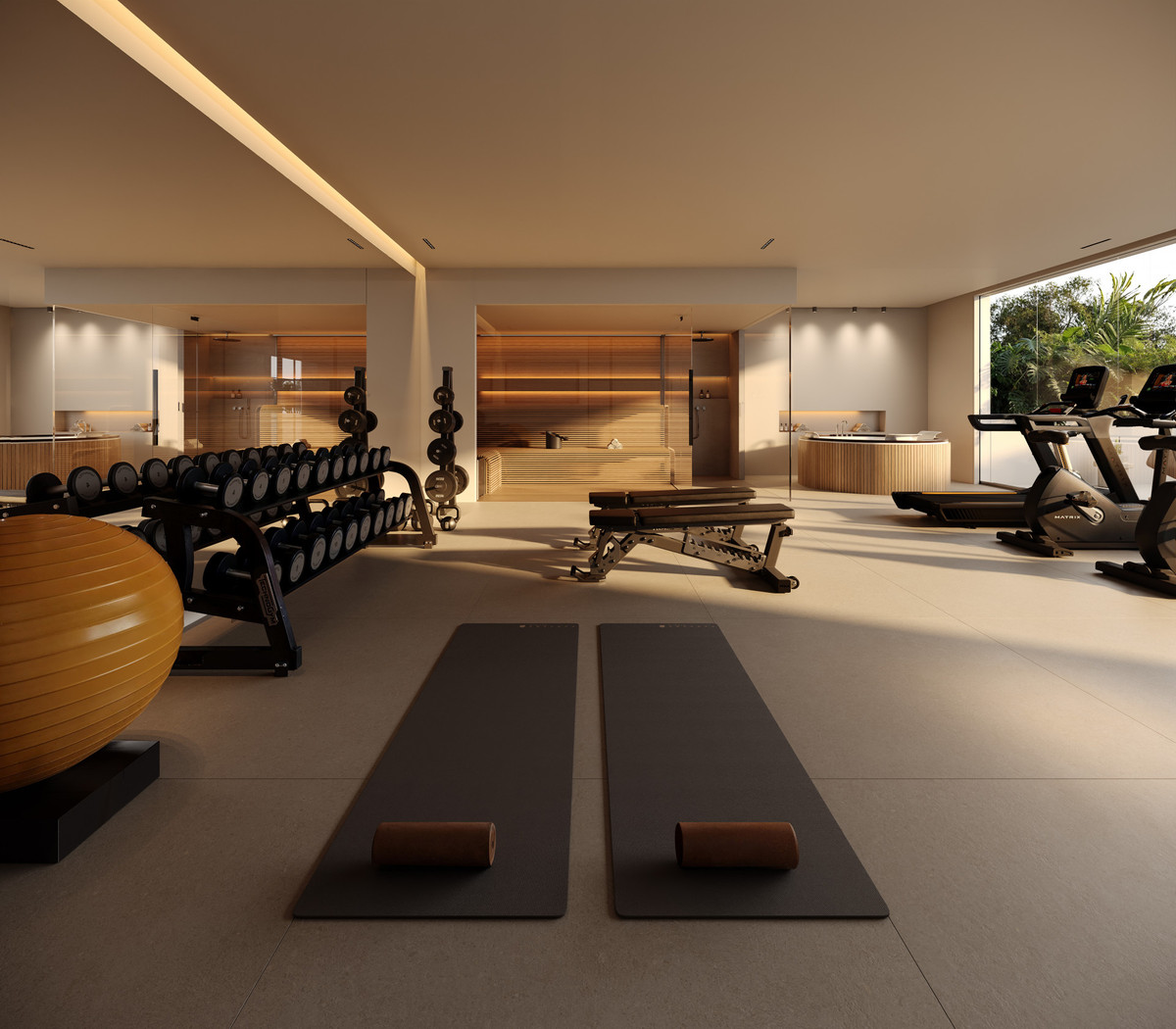 Descendiendo desde este nivel de acceso llegamos a la planta superior, que incluye el núcleo de comunicación vertical, un distribuidor, un aseo de cortesía, un cuarto técnico, un cuarto eléctrico y un gimnasio con sauna que se abre a una terraza sombreada por pérgola, creando un área privada de bienestar con abundante luz natural y confort.