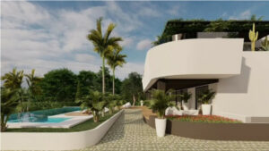 La planta principal puede albergar un salón-comedor de 100 m², cocina de 30 m² y un dormitorio de 35 m². En la primera planta se proyectan tres dormitorios en suite. El solárium admite la instalación de jacuzzi y cocina exterior con vistas al mar.