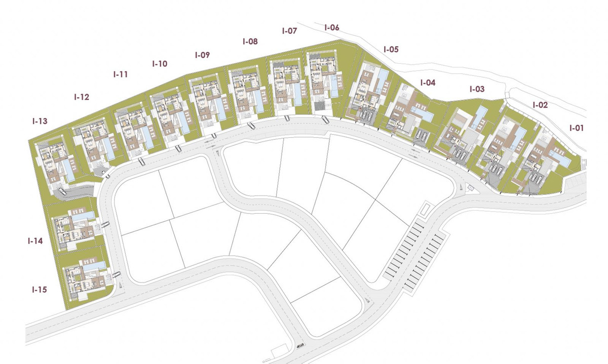 Cada villa se adapta individualmente a la topografía natural de la ladera, creando una urbanización cerrada que transmite exclusividad, no masificación.