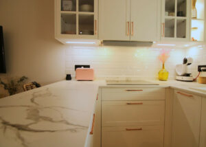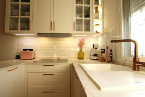 Cocina de diseño con barra americana, equipada con electrodomésticos integrados de primeras marcas.