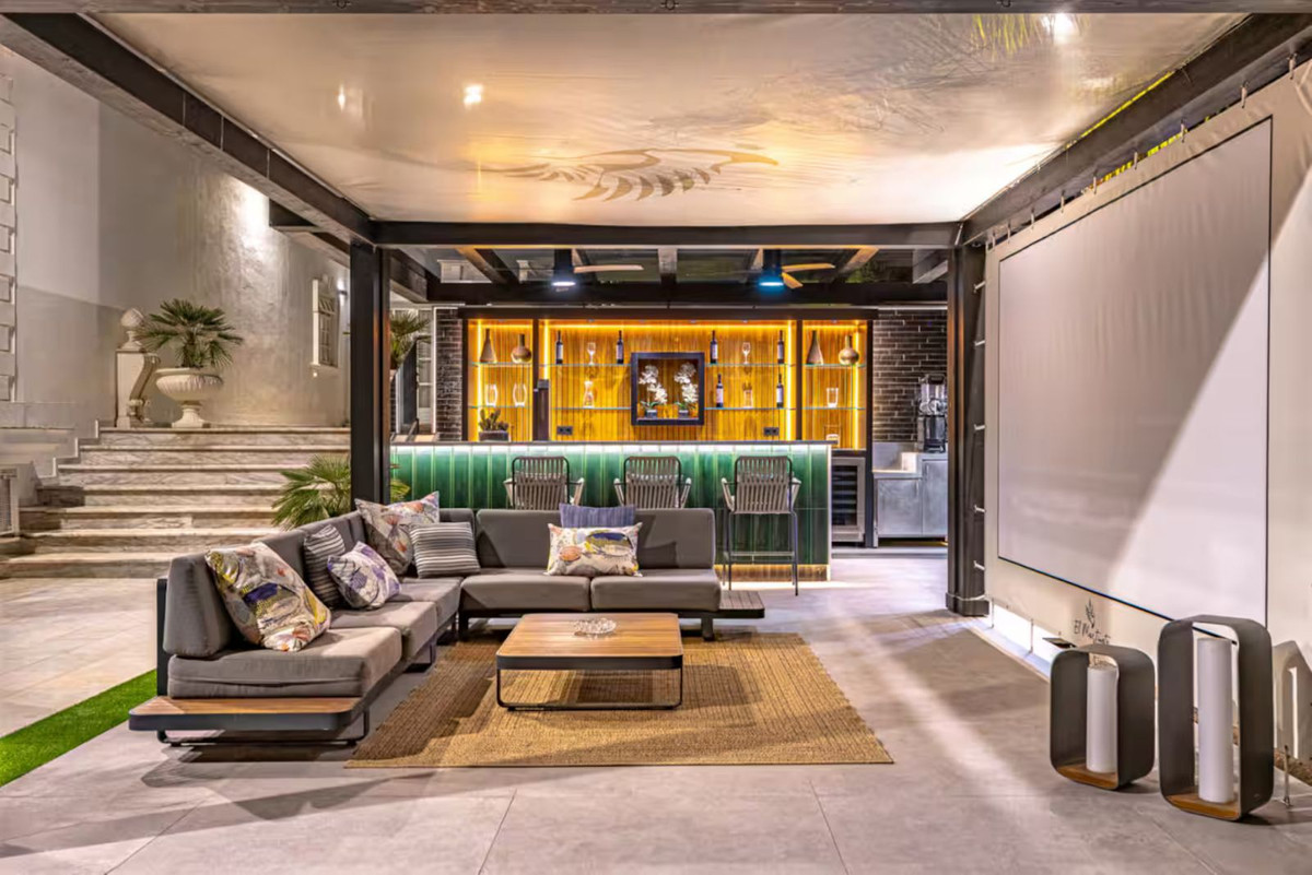 • Lounge exterior con bar y pantalla de cine