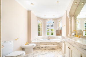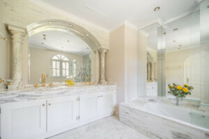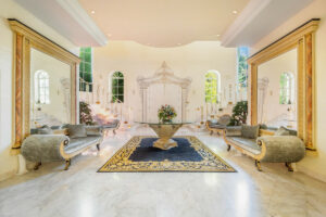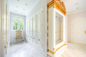 La propiedad le da la bienvenida con una imponente puerta de entrada que da paso a un amplio camino de entrada. Este da acceso a un garaje subterráneo de cuatro plazas, dos garajes adicionales en la planta baja y un amplio espacio exterior para ocho vehículos adicionales. La entrada a la casa principal da paso a un magnífico recibidor de doble altura con una impresionante escalera imperial doble.