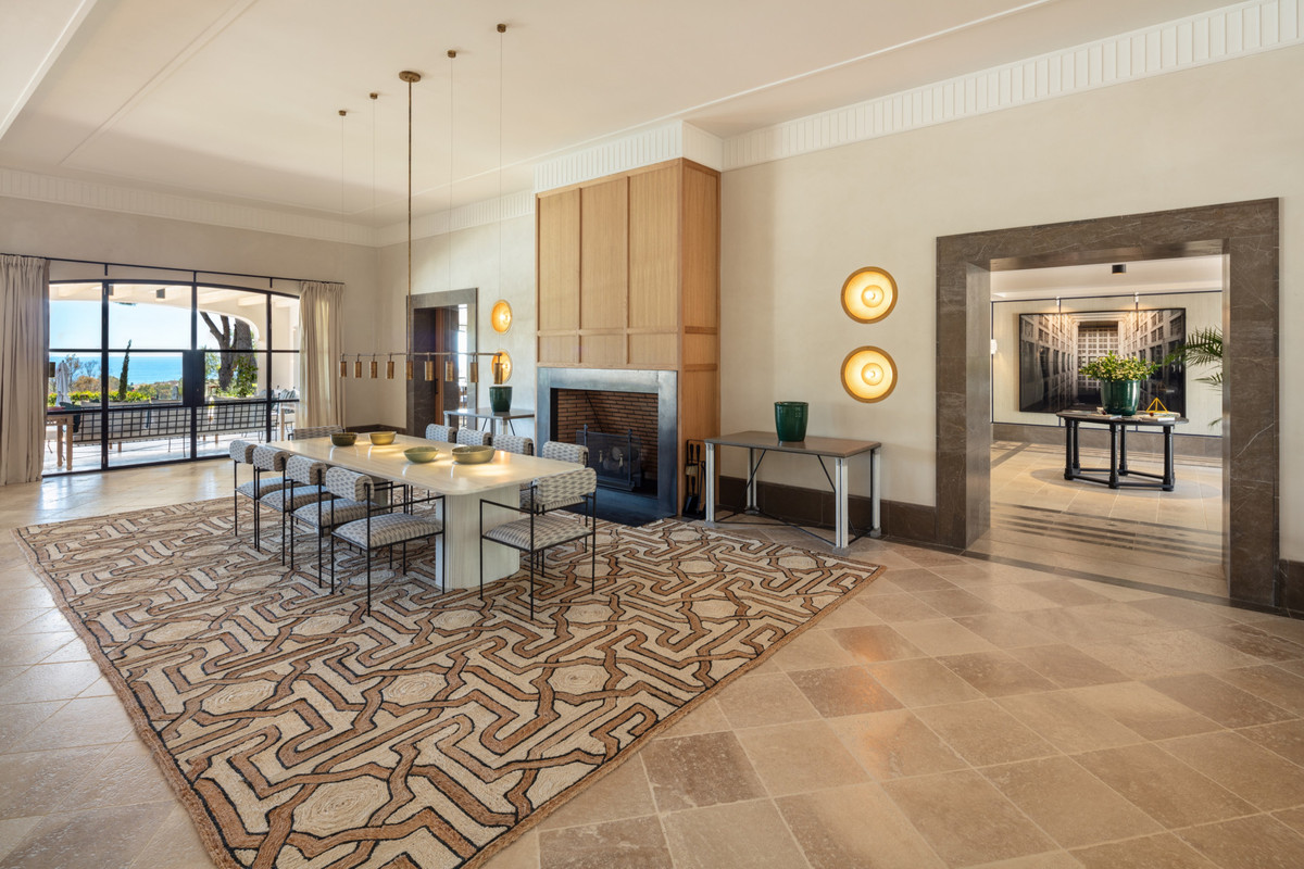 La exquisita cocina cuenta con una despensa separada y una isla para el chef, una impresionante cocina de gas Lacanche de época, armarios de madera incorporados para el almacenamiento, nevera para vinos y frigorífico. El luminoso comedor tiene vistas panorámicas al jardín y al mar y está cómodamente conectado con el patio exterior cubierto. Esta impresionante finca no podría estar completa sin su oferta de múltiples y acogedoras zonas exteriores. Fiel a su herencia española, podrá deleitarse con su arquitectura andaluza, con amplios patios cubiertos y descubiertos, detalles en los techos con vigas de madera, una fuente de agua en el centro, exuberante vegetación y románticos jardines cuidados, una gran piscina con vistas al horizonte azul y su propia pista de pádel.