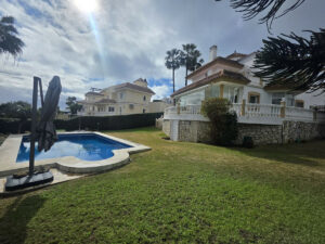 Villa con jardín y piscina privados en venta en Calahonda, Mijas Costa. Esta villa única, orientada al sureste, se encuentra en excelentes condiciones. Fue construida en el año 2000 con materiales de alta calidad. Destacan sus ventanas de doble acristalamiento, sistema de seguridad, una amplia terraza acristalada con vistas al mar, calefacción central, azotea, plaza de aparcamiento privado, sótano, piscina privada y un amplio jardín. Cerca de Marbella y del aeropuerto y la ciudad de Málaga. La villa ofrece en la planta baja una amplia cocina abierta con acceso al salón-comedor, un trastero y un baño completo. Desde el salón se accede a la gran terraza con buenas vistas al valle y al mar. En la planta superior se encuentran dos dormitorios (uno de ellos en suite y con acceso a una gran terraza) y dos baños. En la planta superior hay una azotea con magníficas vistas. Posibilidad de construir hasta un total de tres o cuatro dormitorios debido al gran espacio del sótano.