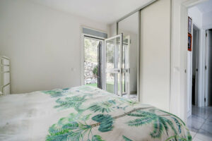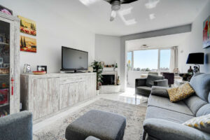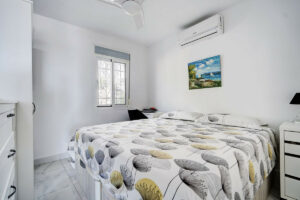 El interior presenta una distribución luminosa y moderna. El salón-comedor cuenta con grandes ventanales que aportan abundante luz natural y ofrecen vistas al mar, además de una chimenea eléctrica ideal para los meses más frescos. La cocina moderna está totalmente equipada con electrodomésticos y dispone de una práctica ventana pasaplatos que comunica directamente con la terraza, muy útil para comer al aire libre. La vivienda cuenta con dos dormitorios dobles con aire acondicionado frío/calor y un baño completo con bañera. Todas las ventanas son de doble acristalamiento y están equipadas con mosquiteras.