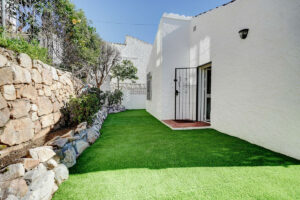 En el exterior, la propiedad dispone de una terraza principal con vistas al mar y barbacoa de obra, además de unas escaleras que conducen a una terraza en la azotea con vistas aún más amplias, tomas de corriente y sol durante todo el día. El jardín rodea el bungalow y está terminado con césped artificial de bajo mantenimiento. También cuenta con un trastero exterior e internet por fibra óptica instalado. Las zonas comunes están muy cuidadas y son amplias, con una gran piscina comunitaria. Un centro comercial con supermercados, farmacia, bares y restaurantes se encuentra a unos 3 minutos a pie, y la playa se puede alcanzar en aproximadamente 15 minutos caminando. Se vende completamente amueblado e incluye garaje privado.