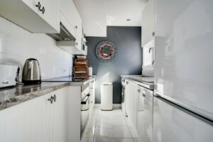 Cocina moderna equipada con ventana pasaplatos a la terraza