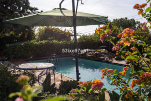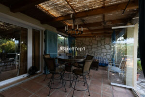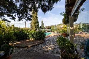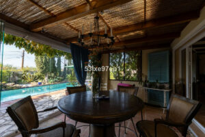 Desde el salón se accede a un invernadero acristalado con puertas y ventanas que se abren completamente, con espacio para una mesa de comedor y un sofá. Desde aquí se accede directamente a la zona de la piscina y al fantástico y frondoso jardín.