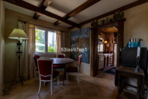 El salón ofrece amplio espacio para un sofá, chimenea y zona de comedor. La cocina, de estilo antiguo y rústico, cuenta con abundante espacio de almacenamiento y encimeras.