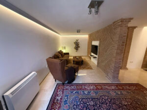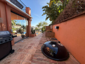 La acogedora sala de estar, con chimenea, se integra a la perfección en la cocina abierta, creando una zona de estar luminosa y espaciosa. Desde aquí, la sala de estar se abre a una terraza cubierta con zona de barbacoa, un hermoso jardín maduro y una piscina climatizada, ideal para disfrutar al máximo del estilo de vida mediterráneo.