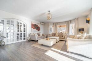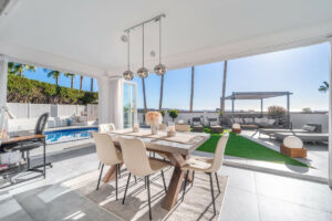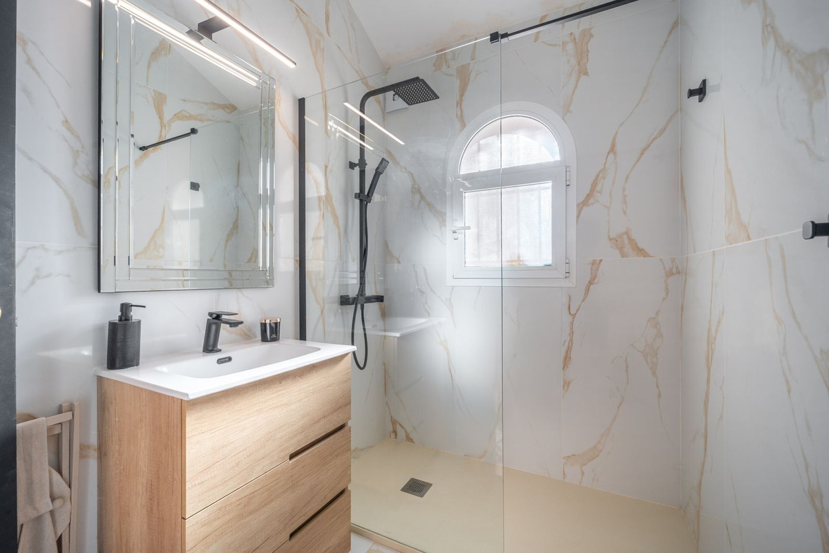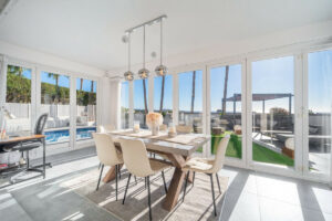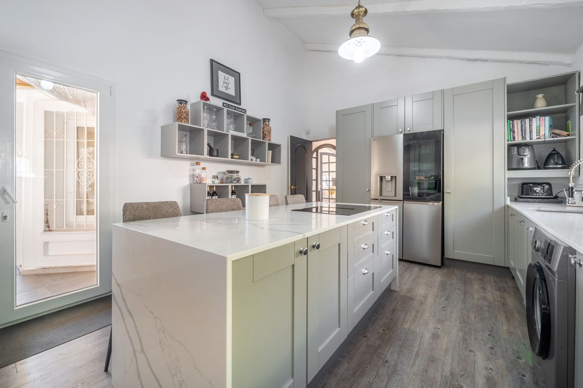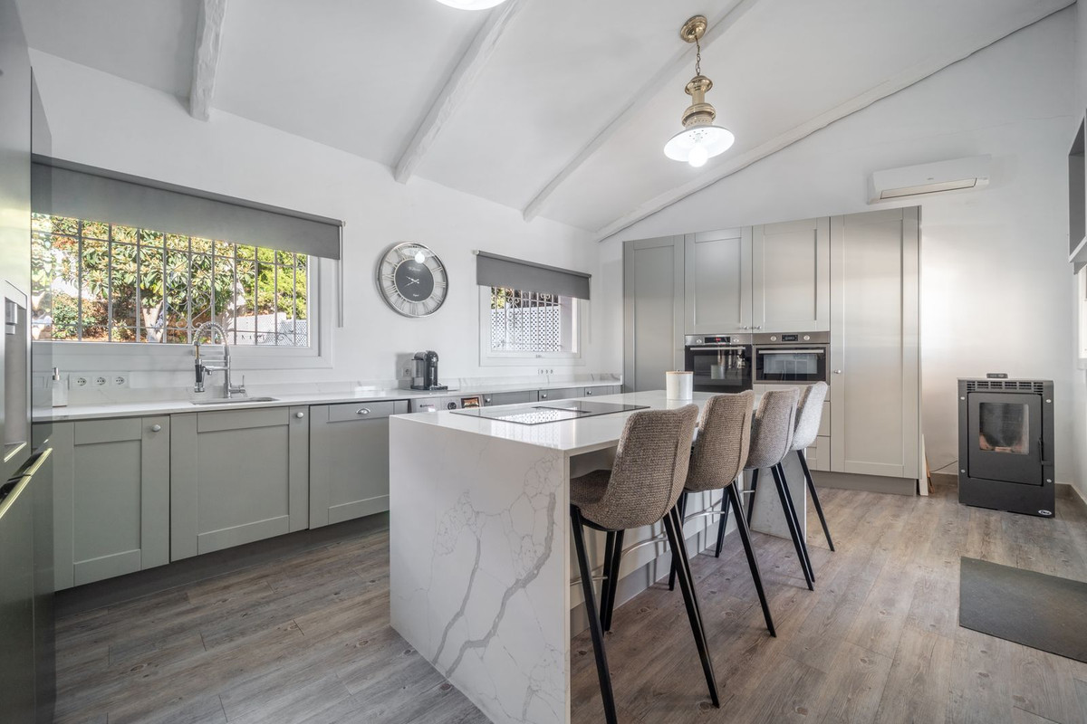 La villa ha sido recientemente renovada y decorada con buen gusto. En la planta de entrada encontrará dos dormitorios de invitados que comparten un baño, una cocina a estrenar con isla, un amplio y luminoso salón con chimenea que da a un invernadero utilizado como comedor. Todas las ventanas del invernadero son plegables, lo que da acceso al jardín de fácil mantenimiento con vistas espectaculares, varias zonas de estar, una gran piscina y una cocina exterior con barbacoa.