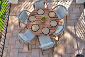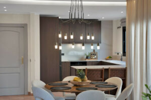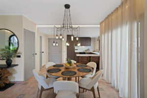 La planta principal está pensada para disfrutar y compartir. La cocina de concepto abierto, el comedor y el salón se integran en un espacio amplio y luminoso que se prolonga hacia la terraza. En conjunto, crean una zona perfecta para reuniones familiares, cenas con amigos o agradables veladas de verano.