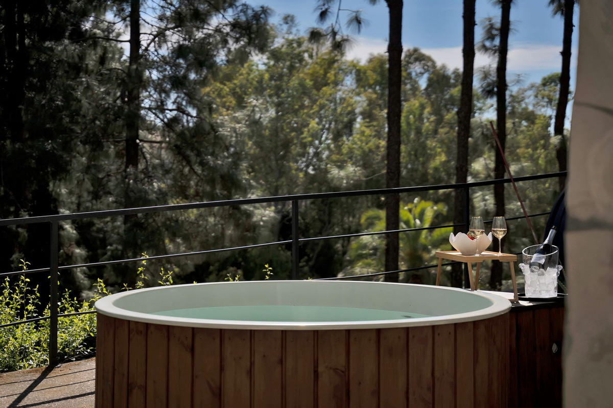 Jardín privado con jacuzzi y tumbonas