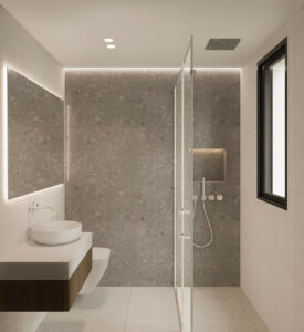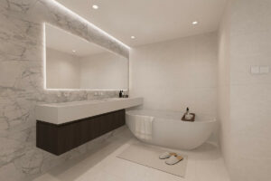 La propiedad incluye tres espaciosas habitaciones, todas con baño privado, y un total de cinco baños, lo que garantiza comodidad y privacidad. Cada habitación está equipada con aire acondicionado independiente, que proporciona control de temperatura durante todo el año.