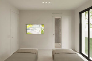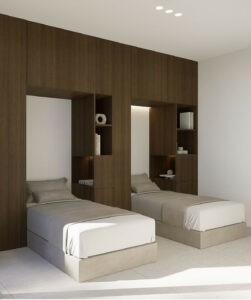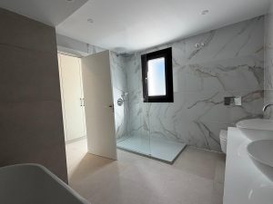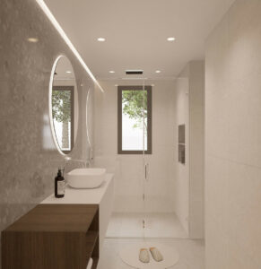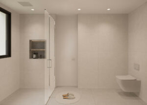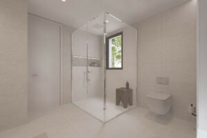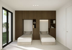 Rebosante de luz natural, la villa cuenta con salas de estar diáfanas con grandes ventanales y puertas de cristal que conectan a la perfección los espacios interiores y exteriores, y disfruta de agradables vistas al mar. La moderna cocina americana cuenta con una gran isla central con placa de cocción integrada, ideal tanto para el día a día como para recibir invitados.